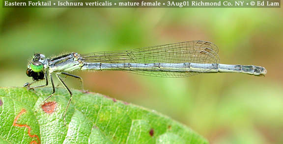 | Like other Forktail species, the Eastern female has a number of color forms and variations. Immature females are typically orange but a minority are patterned like the male. These malelike forms are usually pale blue-green on the thorax with varying amounts of blue on the abdomen tip. All immature forms eventually turn gray upon maturity. | |||||||||||||||