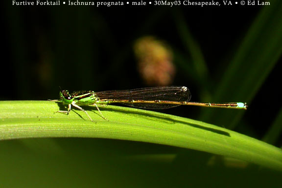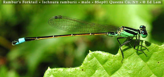| Like all damselflies, newly emergent adults are dully colored. Over a couple of days, their patterns emerge and their colors brighten. Male Eastern Forktails become bright green and black on the head and thorax. Areas that are green are parts of the face, the lower portion of the eyes, spots behind the eyes (called eyespots), a narrow shoulder stripe (called the antehumeral stripe), the sides of the thorax, and the upper legs (the femurs). The abdomen is mostly black. There is some green mostly on the lower sides of segments 1 - 3, but the most important and noticeable marking is the blue that covers segments 8 & 9. On the sides of these segments are rectangular black marks. Similar species: The sprites (Nehalennia) have metallic green thoraxes and lack shoulder stripes and eyespots. Of the six species of forktail in the Northeast, the males of five species have green and black thoraxes but different abdomen patterns. The male Fragile Forktail (I. posita) has no blue on the abdomen. The male Rambur's Forktail (I. ramburii) has segment 8 completely blue, segment 9 has blue on the sides but is black on top. The male Furtive Forktail (I. prognata) has only segment 9 completely blue. The abdomen of the male Citrine Forktail (I. hastata) is mostly bright yellow. | |||||||||||||||